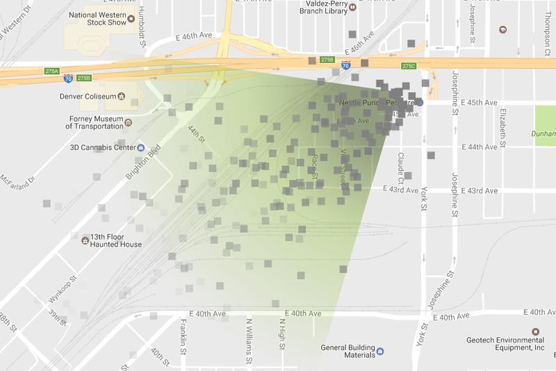 A map showing the aproximate area where you can smell the Purina pet food plant.