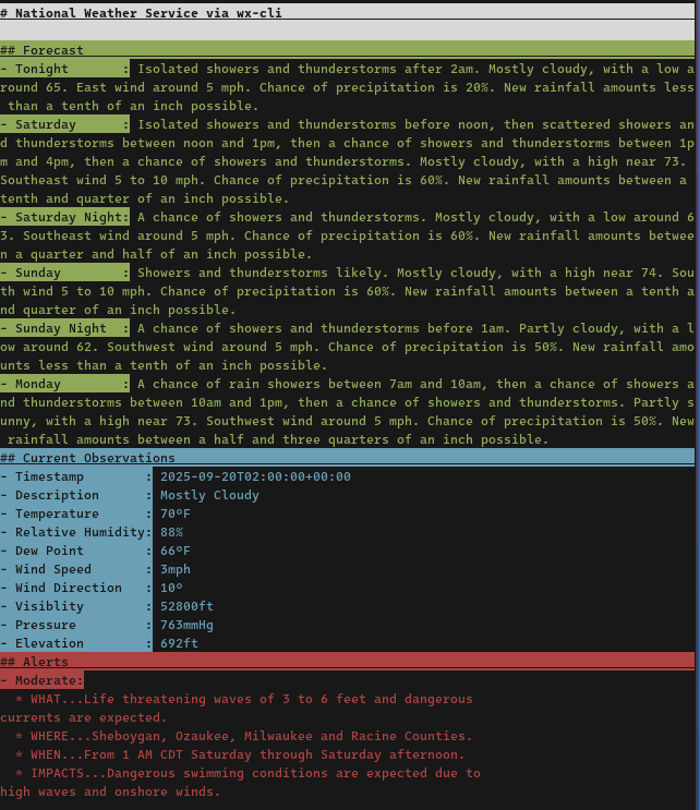 CLI application to display the National Weather Service forecast, observation, and alerts for a lat/long